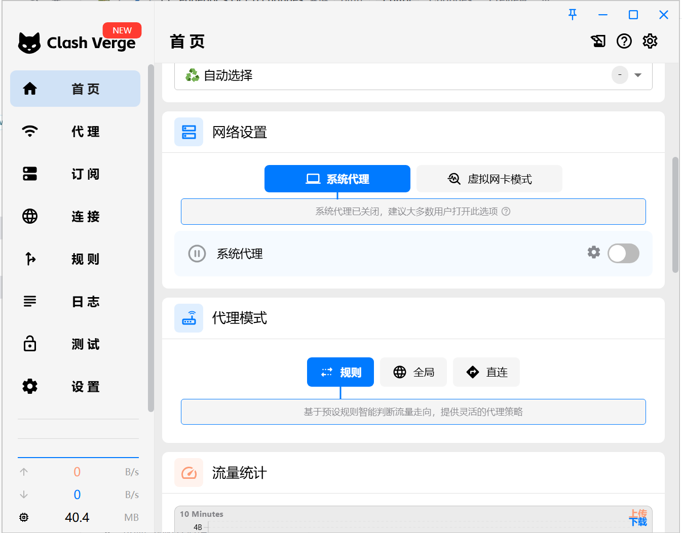 进入“首页”模块,打开“系统代理”,软件即配置完成。需注意若软件意外关闭可能导致全局断网,此时需重启软件,或在Windows设置中关闭系统代理。