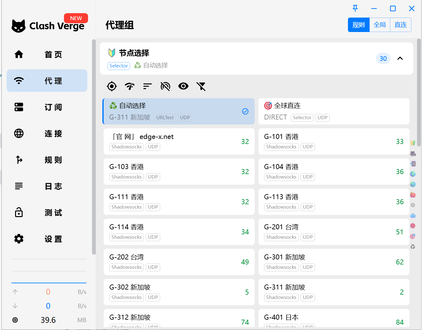 进入“代理”模块,选择您想要连接的节点,右上角模式推荐选择“规则”,若选择全局则国内网站也会消耗流量,选择直连则所有流量均不通过代理